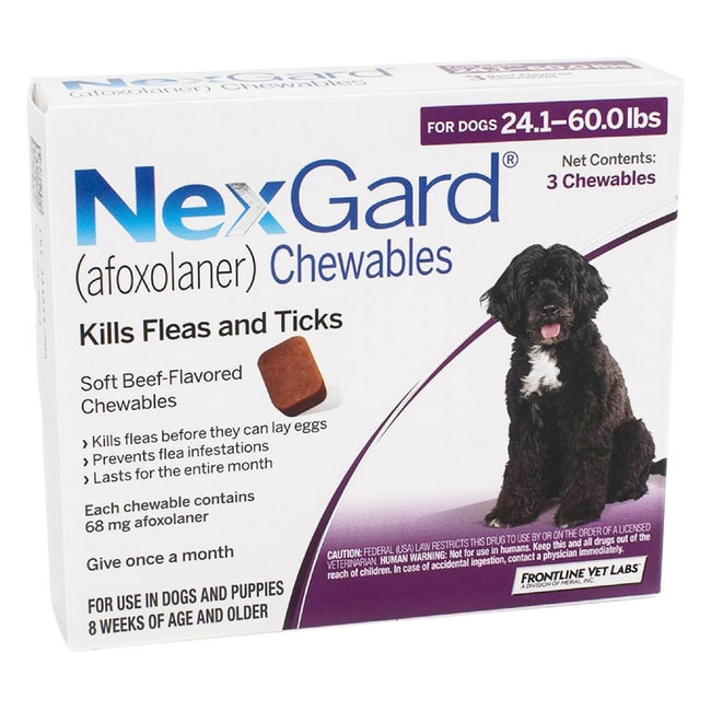 NexGard (afoxolaner) is FDA approved for veterinarian use, and demonstrated 100% effectiveness against adult fleas 24 hours post-infestation for 35 days. NexGard not only kills both fleas and ticks, it's also in the form of a soft, beef-flavored chew which in a recent study, 89% of dogs readily consumed. CAN ONLY GUARANTEE 6 MONTHS OF EXPIRATION