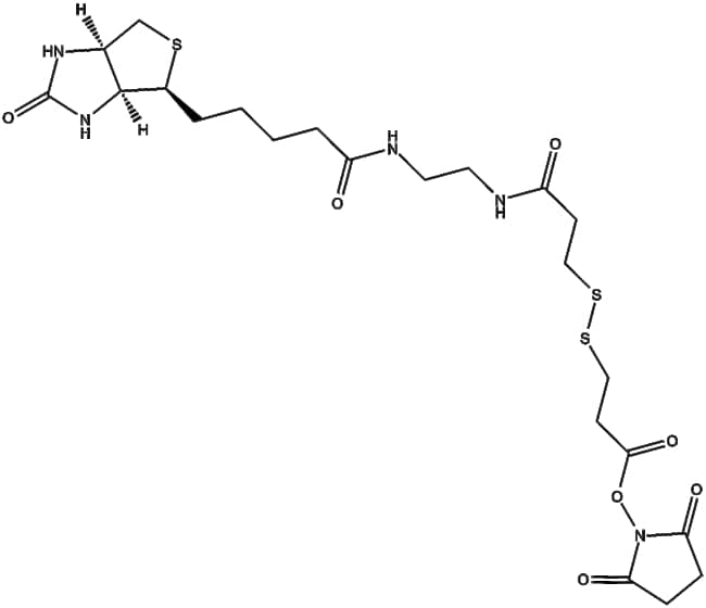 Apexbio Technology LLC NHS-SS-11-Biotin(Synonyms: Sulfo-NHS-SS-Biotin, EZ-Link NHS-SS-Biotin, NHS-SS-D-Biotin, N-Hydroxysuccinimidyl-SS-Biotin), 5mg, CAS: 142439-92-7.