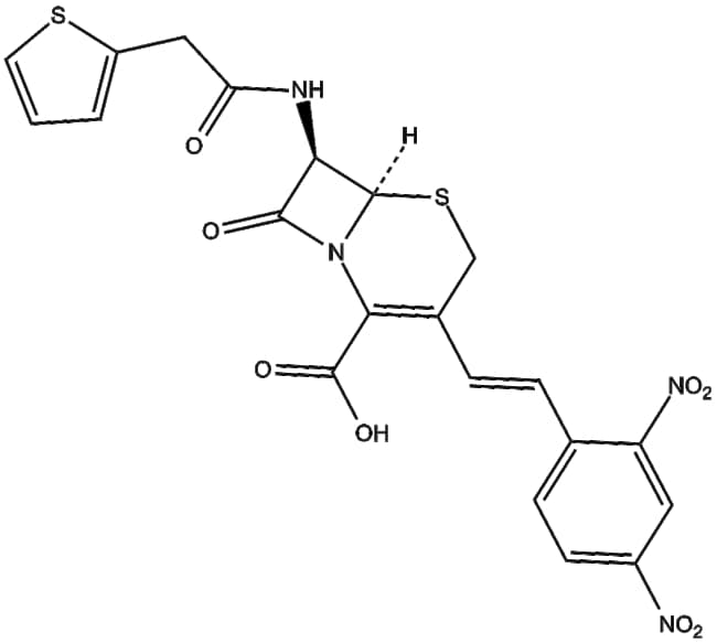 Nitrocefin is a chromogenic cephalosporin substrate commonly employed in biochemical assays to detect -lactamase enzymatic activity -lactamases enzymes prevalent in microbial species catalyze the hydrolysis of -lactam antibiotics such as penicillins and cephalosporins causing antibiotic resistance Upon cleavage by -lactamase enzymes nitrocefin undergoes a measurable colorimetric shift from yellow to red enabling visual or spectrophotometric detection in the range of approximately 380 500 nm Nitrocefin prominently serves in microbiological and clinical research to evaluate resistance profiles of bacterial isolates and in assays for inhibitor activity toward -lactamases Its reported IC50 varies depending on -lactamase type concentration and assay conditions with typical values ranging from approximately 0 5 to 25 M