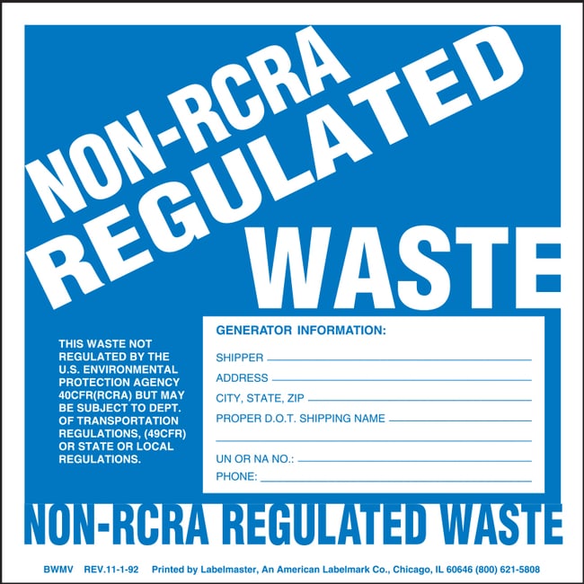 Stock Vinyl Non-RCRA Regulated Waste Labels With Generator Info include the information necessary for marking a container. Vinyl non-RCRA regulated waste labels feature automotive-grade ink pigments and specially formulated adhesives. Constructed of r