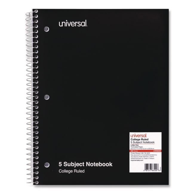 Universal Wirebound Notebook 5-Subject Medium/College Rule Black Cover (200) 11x8 5 Sheets