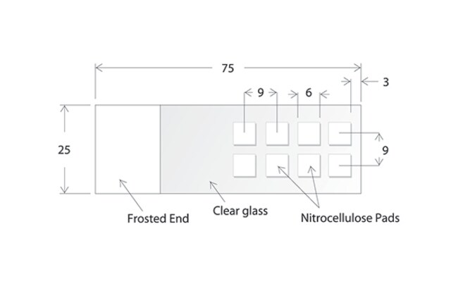 ONCYTE is a three-dimensional microarray comprised of a combination of nitrocellulose polymer and proprietary chemistry that provides increased protein affinity and binding. It also provides enhanced fluorescent chemiluminescent, radiographic, colormetric and visual signal compared to glass or other coated glass surfaces. NOVA for highest fluorescent sensitivity but reduced binding capacity.