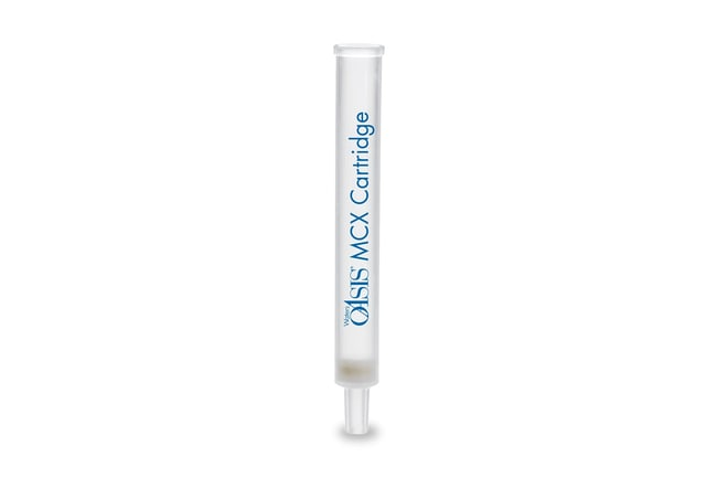 The 1 cc flangeless Oasis MCX cartridges contain the Oasis MCX, which is a novel, mixed-mode polymeric sorbent that has been optimized to achieve higher selectivity and sensitivity for extracting basic compounds with cation-exchange groups. Since the Oasis MCX sorbent is water wettable, it maintains its capability for higher retention and excellent recoveries even if the sorbent runs dry, which means there is no need to take extraordinary steps to keep the sorbent beds from drying out during the critical steps prior to sample loading. The flangeless configuration allows the cartridges to be closely packed for processing in specialized automated SPE systems.