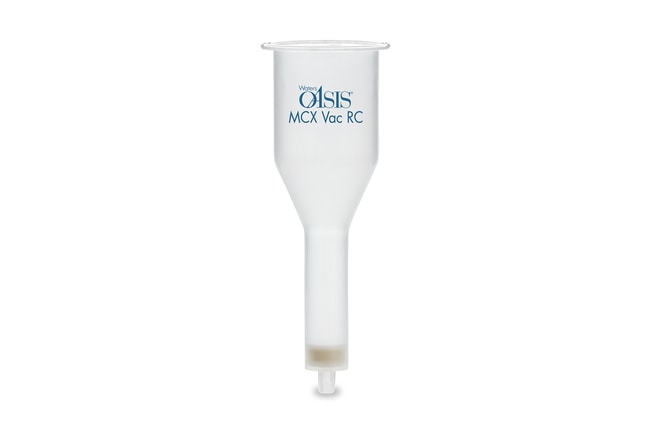 These Vac RC cartridge contains the Oasis MCX sorbent, which is a novel, mixed-mode polymeric sorbent that has been optimized to achieve higher selectivity and sensitivity for extracting basic compounds with cation-exchange groups. Since the Oasis MCX sorbent is water wettable, it maintains its capability for higher retention and excellent recoveries even if the sorbent runs dry, which means there is no need to take extraordinary steps to keep the sorbent beds from drying out during the critical steps prior to sample loading. These cartridges feature an integral 20 cc funnel-shaped reservoir for convenient processing of greater volumes or samples or solvents. They can be used with robotic sample preparation equipment or with vacuum manifolds.
