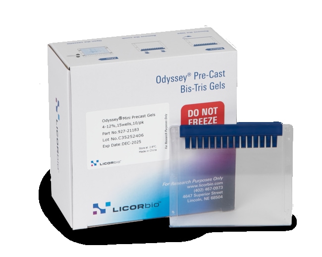 Odyssey Mini Gels are polyacrylamide gels designed to separate a wide range of protein sizes via PAGE or SDS-PAGE. Each box contains 10 pre-cast gels. Our gels feature larger well volumes for easier sample loading and are cast in a neutral pH buffer to increase gel stability. They also run at neutral pH, which minimizes protein modification compared to Tris-glycine gels. Odyssey Mini Gels are available in several gradients with 10, 12, or 15 numbered wells. Our gels feature a shelf life of up to 6 months at room temperature and 12 months at 2–8C.