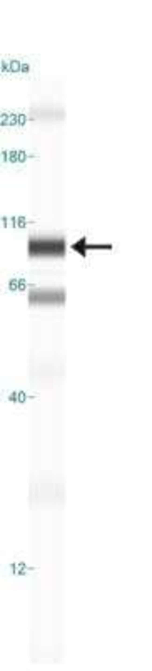 In Western blot, multiple protein isoforms can be seen at approximately 90, 80 and 65 kDa.