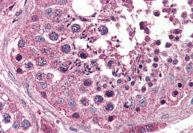 Percent identity with other species by BLAST analysis: Human, Gibbon, Monkey, Marmoset, Rat (100%); Mouse, Dog, Panda, Rabbit (94%); Horse, Opossum (88%); Turkey (81%). For IHC(P), use proteinase K antigen retrieval. After incubation with the primary antibody, slides were incubated with biotinylated secondary antibody, followed by alkaline phosphatase-streptavidin and chromogen.