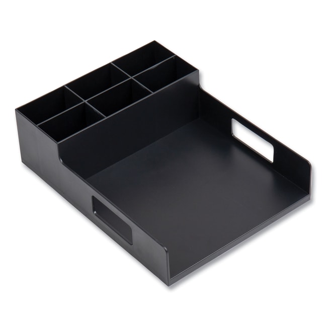 From office breakrooms to holiday parties use this portable countertop organizer and serving tray to streamline your buffet line in your office breakroom to store coffee supplies or other condiments or in your bedroom as a cosmetics and toiletries organizer Lightweight and portable it s easy to place it wherever it s needed Seven different compartments allow for the organization of many types of utensils (or pens pencils and highlighters etc ) giving you plenty of options to place items easily with ample room for storage Place napkins in one compartment knives forks spoons and other accessories in the others and use the large compartment in the front to store plates (or papers if you re using this tray in the office) Its durable construction is ideal for parties or daily use and it can be used indoors or outdoors Its surface is also easy to clean after every event with mild dish soap and water so it s ready for your next get-together Utensil Dispenser Type- Tray H