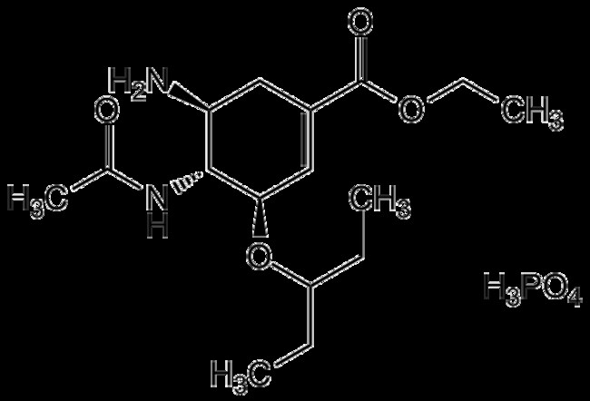 Chemical. CAS: 204255-11-8. Formula: C16H28N2O4 . H3PO4. MW: 312.4 . 98.0. Oseltamivir phosphate is an influenza viral neuraminidase inhibitor. It is an antiviral prodrug targeted against the influenza viruses. Once hydrolyzed in the liver to its active metabolite, oseltamivir carboxylate, it can competitively inhibit viral neuraminidase (IC50s=0.1-4.9nM for influenza neuraminidases A and B). The enzyme cleaves the sialic acid which is found on glycoproteins on the surface of human cells that helps new virions to exit the cell. Thus oseltamivir is blocking the release of new viral particles from a host cell. Oseltamivir phosphate is used clinically to treat influenza A and influenza B, and to prevent flu after exposure. It potentially could be used to reduce the spread of the SARS-CoV2 and counteract against the transmission of COVID-19.