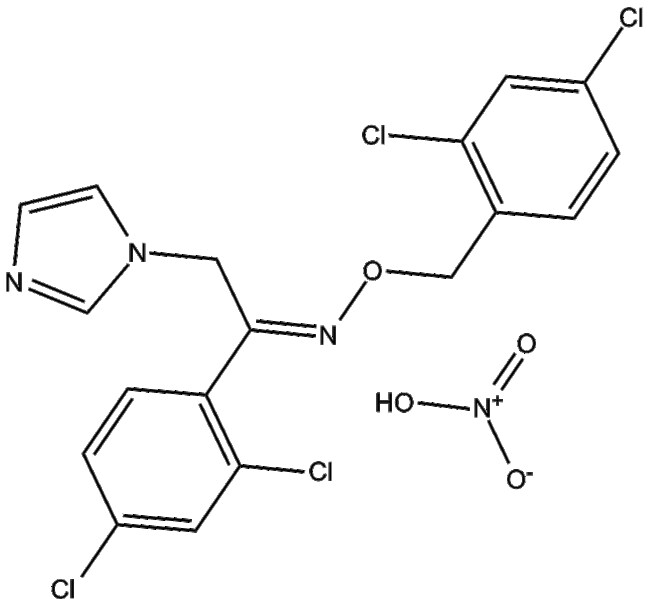 Oxiconazole nitrate (CAS 64211-46-7) is an imidazole derivative with antifungal properties It is designed to inhibit ergosterol synthesis thereby perturbing fungal cell membrane integrity and cellular functions Oxiconazole nitrate exerts its biological activity primarily through inhibition of ergosterol synthesis in fungal cells In in vitro assays oxiconazole nitrate demonstrates fungistatic activity against human pathogenic dermatophytes including Trichophyton rubrum T mentagrophytes and Epidermophyton floccosum with IC50 values typically in the submicromolar range Based on these pharmacological properties oxiconazole nitrate holds research potential in the treatment of fungal infections such as trichophytosis and vaginal candidiasis and has been evaluated in both topical and systemic experimental models