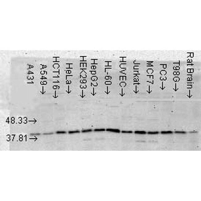 Detects approximately 38kDa protein corresponding to p38 alpha MAPK when loaded with 6 ng of purified p38 alpha by chemiluminescent immunoblot analysis using Goat anti-mouse IgG:HRP as the secondary antibody. Detects approximately 38kDa.