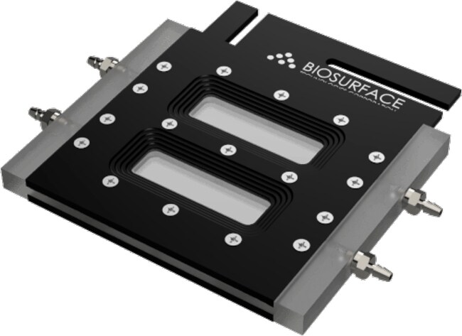 Biosurface Technologies Corp Dual Channel Transmission Flow Cell w/injection ports (polycarbonate flow channel; platform stage mount), for Growing and Imaging of Biofilms.