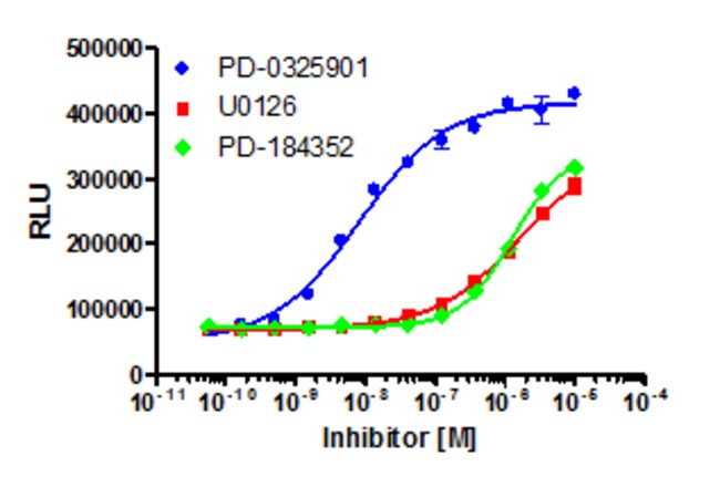 PD0325901 is a synthetic, orally active MEK1 and MEK2 inhibitor (Ki=1.1 and 0.79, respectively) that research shows inhibits the growth of melanoma cell lines in vitro and in vivo. Has antiangiogenic activity via inhibiting production of VEGF proangiogenic cytokines, and suppresses the phosphorylation of ERK and the RAS/RAF/MEK/ERK signaling pathway, which is frequently active in tumors. Provided as 5mg of dry powder. These highly purified, pre-validated control ligands have been used to qualify our InCELL Hunter, PathHunter and cAMP Hunter cell lines as well as our Assay Ready Kits. Ligands are conveniently supplied with a recommended reconstitution buffer. For detailed information and product-specific datasheet, visit www.discoverx.com/ligands.