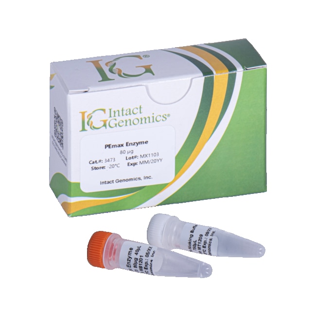 Intact Genomics (IG) PEmax enzyme is the purified recombinant Streptococcus pyogenes Cas9 nickase mutant (H840A)-Murine Moloney Leukemia Virus-Reverse Transcriptase (MMLV-RT) fusion protein3-4 containing a nuclear localization signal (NLS) at the C-terminal for targeting to the nucleus. This enzyme is designed to perform CRISPR prime-editing3-4. The physical purity of this enzyme is ≥85% as assessed by SDS-PAGE with Coomassie blue staining.Product Includes: PEmax enzyme 5x PEmax Nicking Buffer: 20 mM HEPES, 100 mM NaCl, 5 mM MgCl2, 0.1 mM EDTA, pH 6.5 @ 25 °CStore all components at -20°C.