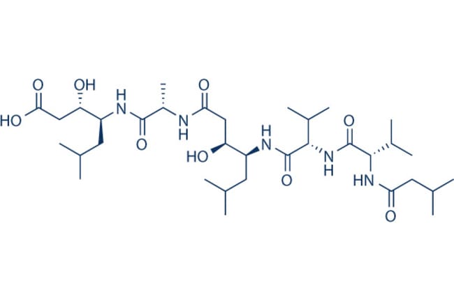 Pepstatin A (Pepstatin) is a potent aspartic protease inhibitor, and also inhibits HIV replication. Pepstatin A is also an inhibitor of cathepsins D and cathepsins E. Pepstatin A inhibits autophagy by suppressing lysosomal proteases. *For Research & Development use only. Product is not intended for drug, household, or human consumption.