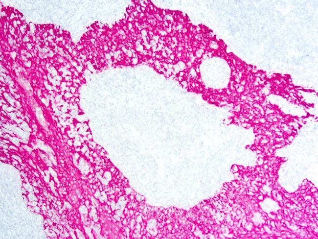 PermaRed/AP is a substrate-chromogen system designed to be used for either IHC or ISH when using alkaline phosphatase detection. PermaRed/AP produces a brilliant dark red color. PermaRed/AP is insoluble in organic solvents; therefore, sections can be dehydrated in alcohol, cleared in xylene (or a xylene-substitute), and permanently mounted. This chromogen substrate system may be used for both automation and manual use.