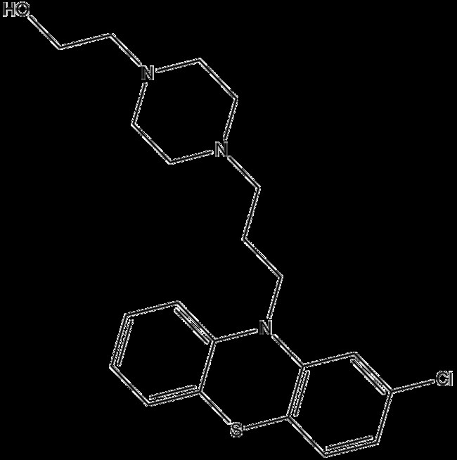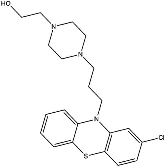 Perphenazine (CAS 58-39-9) is a phenothiazine derivative that primarily acts as an antagonist at dopamine D receptors with dissociation constant (Ki) of 1 4 nM and also displays significant binding to histamine H (Ki 8 nM) A-adrenergic (Ki 10 nM) A- B- C-adrenergic and muscarinic M (Ki 1848 nM) receptors Its antagonism at D receptors underlies its ability to modulate dopaminergic neurotransmission while interaction with additional receptor subtypes may account for its effects on the central nervous system and antiemetic properties Perphenazine is widely utilized in research investigating mechanisms of antipsychotic activity dopaminergic regulation and drug-induced cell death pathways