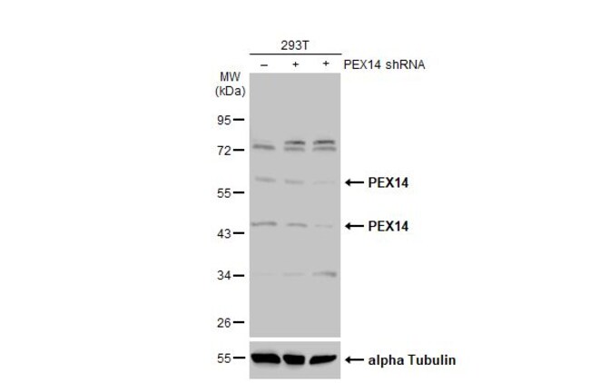 | dJ734G22.2; NAPP2; NF-E2 associated polypeptide 2; PBD13A; Peroxin 14; peroxin-14; peroxisomal biogenesis factor 14; peroxisomal membrane anchor protein PEX14; peroxisomal membrane anchor protein Pex14p; peroxisomal membrane protein PEX14; peroxisomal protein Pex14; Pex14; Pex14p; PEXE; PTS1 receptor docking protein; PTS1 receptor-docking protein; R75137 | |