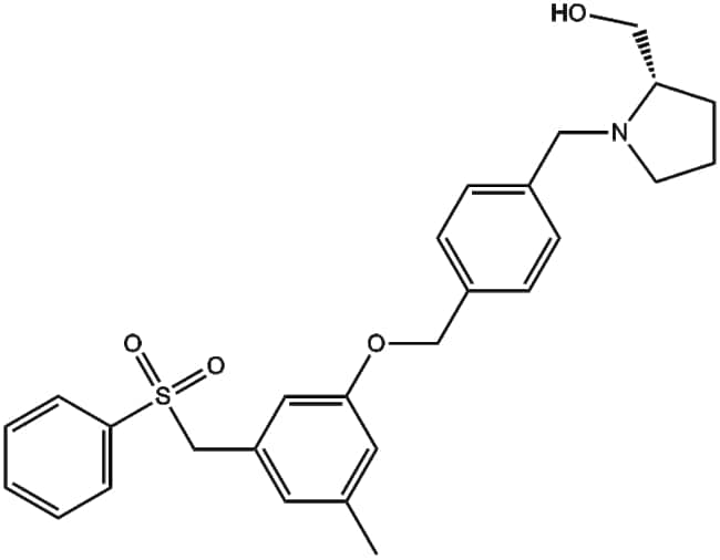 PF-543 (CAS 1415562-82-1) is a cell-permeable inhibitor targeting sphingosine kinase 1 (SphK1) an enzyme that phosphorylates sphingosine to sphingosine-1-phosphate (S1P) It displays potent inhibitory activity against SphK1 with an IC50 of 3 6 nM through sphingosine-competitive (non-ATP competitive) binding Treatment of SphK1-overexpressing head and neck cancer (1483) cells led to a ten-fold decrease in S1P levels confirming effective target engagement PF-543 is widely utilized as a research tool in studies investigating SphK1-mediated signaling pathways in cancer biology and immune cell trafficking