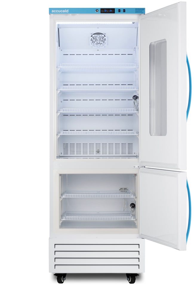 The ARFG18PV features an upper refrigerator compartment with a small window and independent manual defrost freezer below. Both sections include adjustable plastic-coated wire shelves that can be positioned at 1/2 inch increments to accommodate virtually any sized item. This unit includes LED internal lighting with an on/off rocker switch. The ARFG18PV features a dual microprocessor temperature controller (refrigerator range: +2 to +8ºC; freezer range: -30 to -10ºC). The buffered temperature probes are encased in glycol-filled bottles to better simulate temperature of the stored product, with an additional sensor that reads air temperature to ensure superior temperature control. The current and min/max temperature display is viewable in Celsius or Fahrenheit to the nearest tenth of a degree. The audible and visual temperature alarms sound if the interiors go out of range. Additional alarms include a power failure alert, door open alarm, and sensor failure alert system.