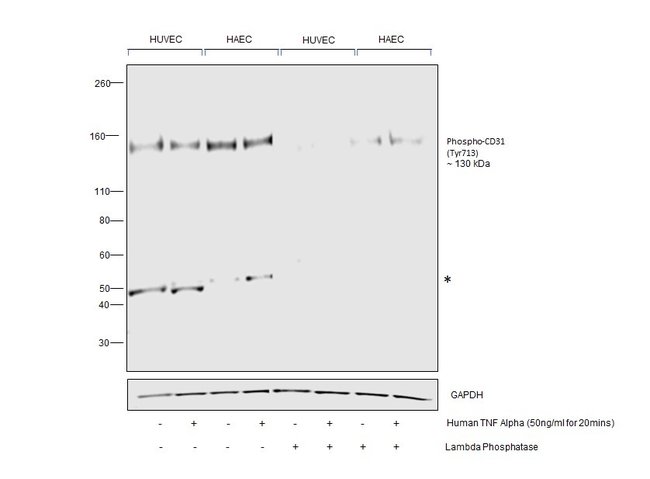 Antibody detects endogenous levels of CD31 only when phosphorylated at Tyrosine 713.
