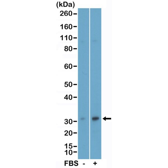 This antibody reacts to human eIF4E only when phosphorylated at Ser209. There is no cross-reactivity to eIF4E that is not phosphorylated. This antibody may also react to mouse or rat Phospho-eIF4E (Ser209) as predicted by immunogen homology.