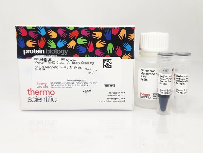 The Thermo Scientific Pierce MHC Class I Antibody Coupling Kit is a comprehensive kitted solution designed for magnetic immunoprecipitation of MHC Class I protein and peptide complexes. It provides all necessary components for antibody coupling and peptide enrichment required for immunopeptidomic studies. This kit features an optimized protocol with guidance all the way through LC-MS analysis.