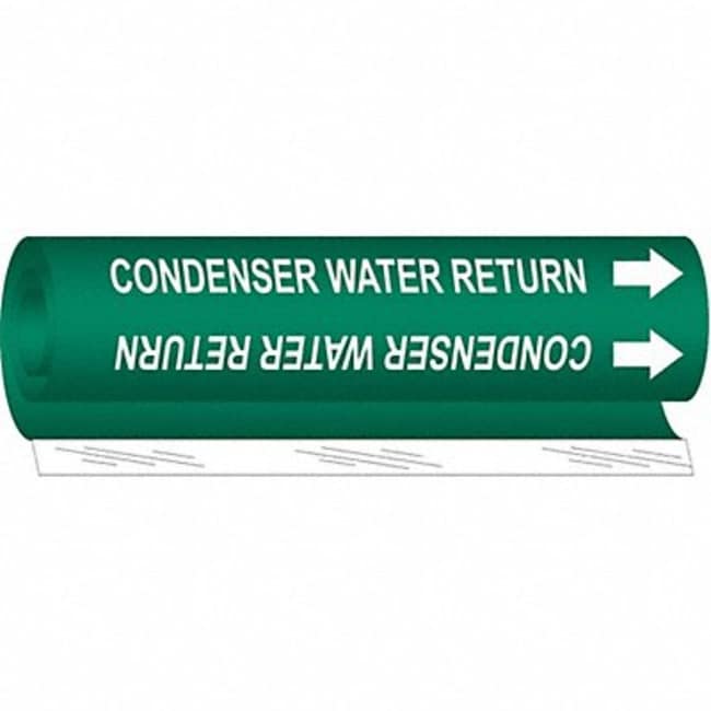 The Brady Pipe Marker for Condenser Water is a self-adhesive vinyl pipe marker that identifies condenser water pipes. It has a legend that reads "Condenser Water" in black text on a light blue background. The marker is 6" tall x 48" long and made from durable vinyl that resists UV rays, chemicals, abrasion, and moisture. It has an aggressive adhesive that bonds instantly to apply on pipes up to 2" in diameter. This pipe marker meets ANSI/OSHA requirements for pipe labeling and identification. It provides clear visual identification of condenser water pipes in industrial facilities.