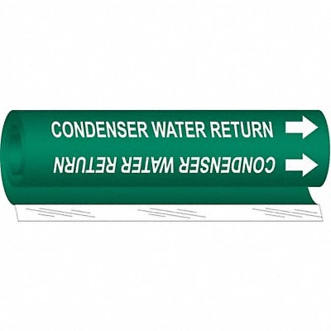 The Brady Pipe Marker for Condenser Water is a self-adhesive vinyl pipe marker that identifies condenser water pipes. It has a legend that reads "Condenser Water" in black text on a light blue background. The marker is 6" tall x 48" long and made from flexible, conformable vinyl that resists UV light, chemicals, abrasion, and moisture. It has an acrylic pressure sensitive adhesive that adheres to PVC, fiberglass, metals, and other common pipe materials. This pipe marker meets ANSI/OSHA requirements for pipe labeling and identification. It is suitable for indoor and outdoor use.