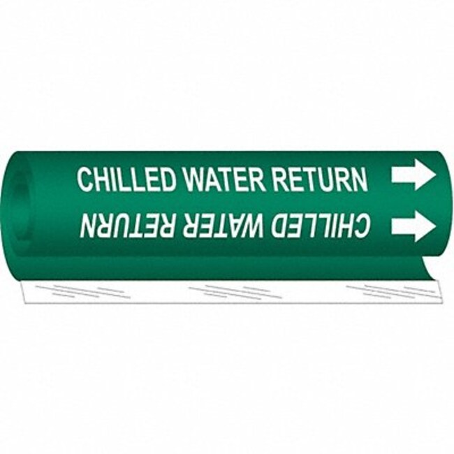 The Brady Pipe Marker for Chilled Water is a self-adhesive vinyl pipe marker that identifies pipes carrying chilled water. It has a blue background with white text reading "CHILLED WATER" and has an operating temperature range of -40°F to 200°F. The marker measures 1.5" height x 9" width and has an adhesive backing for easy application. It is made from flexible, conformable vinyl that resists UV light, abrasion, and chemicals. This pipe marker from Brady helps identify chilled water pipes for safety and compliance.