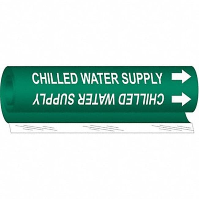 The Brady Pipe Marker for Chilled Water is a self-adhesive vinyl pipe marker that identifies pipes carrying chilled water. It has a blue background with white text reading "CHILLED WATER" and has an operating temperature range of -40°F to 176°F. The marker measures 1-1/2" height x 9" width and has an adhesive backing for easy application. It is made from flexible, conformable vinyl that resists UV light, abrasion, and chemicals. This pipe marker meets ANSI/ASME and NFPA labeling standards and is ideal for identifying chilled water pipes in commercial and industrial facilities.