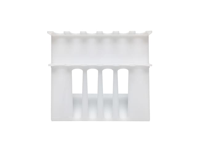 SureStand Pipette racks are unique in their ability to accommodate multi-channel pipettes without sacrificing any of the stability of a traditional acrylic rack. The patent pending "windows" allow the user to insert the multi-channel head longways through the rack, while keeping the body of the pipette stable by securing the pipette at two points; under the finger hook, and near the bottom of the handle. Each SureStand is also outfitted with four non-skid rubber "feet" for extra stability. SureStand is guaranteed to be the sturdiest and most versatile pipette rack in your lab. 6-place rack that accepts four multi-channel pipette slots.