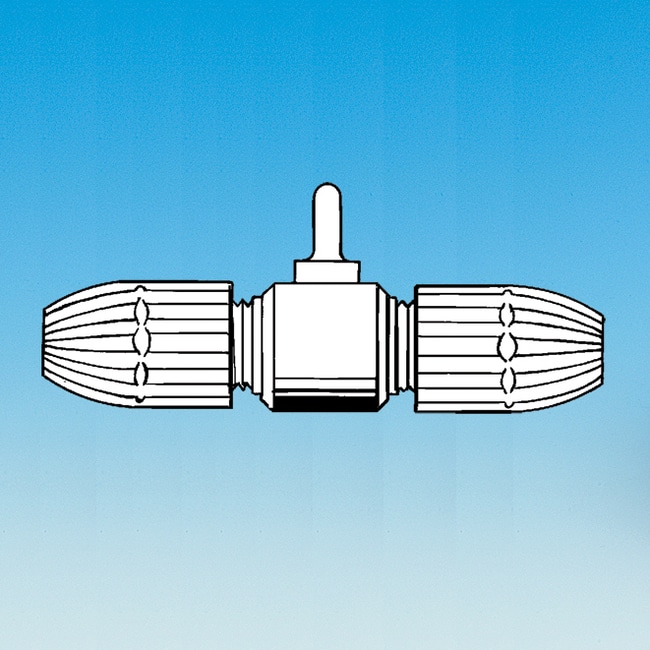 Omnifit two-way tubing connector valve with single Tefzel control valve, rated at 500 psi. Valve has one moving part for long life and trouble-free operation. Unique design prevents the valve from leaking to outside, even at excessive pressures. Body is machined from a single piece of PTFE. Caps are made of polypropylene with Fluoron elastomer seals for instant connection of rigid or flexible tubing within a range of 0.5 to 4mm O.D. Connector has a ¿¿-28 thread at the back of the cap for direct connection to other adapters. Autoclaveable. Pack of 2.