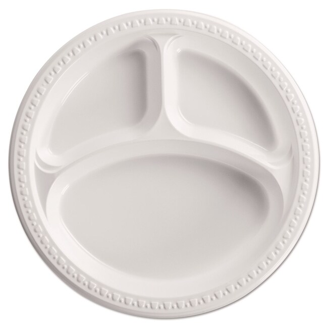 Premium-grade dinnerware provides superior strength and durability Decorative raised-rim border features a tasteful contemporary design Gloss-finished heavyweight plastic ensures rigid cut- and leak-proof performance Nesting stackable pieces help you conserve storage space Heavyweight Three-Compartment Plate Dinnerware Type- 3-Compartment Plate Material Type- Plastic Material(s)- Plastic Shape- Round
