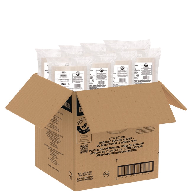 Stylish and durable this dinnerware is made from a molded fiber blend that is PFAS-free It provides a natural look and feel that patrons can connect with and trust Elevate your dining experience with dinnerware that offers both a sustainable and high-quality solution Strong construction avoids bending and folding and is designed to withstand oil and grease Perfect for food truck fare event catering hospital meals and cafeterias Microwavable and suitable for customers to reheat and enjoy ProPlanet Seal This product earns the ProPlanet Seal because it meets ASTM requirements for commercial compostability Dinnerware Type- Plate Material Type- Molded Fiber Material(s)- Fiber-Blend Shape- Square
