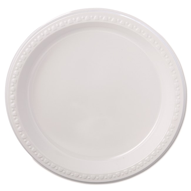 Premium-grade dinnerware provides superior strength and durability Decorative raised-rim border features a tasteful contemporary design Gloss-finished heavyweight plastic ensures rigid cut- and leak-proof performance Nesting stackable pieces help you conserve storage space Heavyweight Dinnerware Type- Plate Material Type- Plastic Material(s)- Plastic Shape- Round