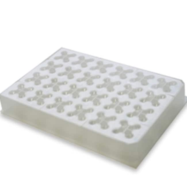 The CombiClover 4 Chamber Crystallization plate utilizes four partitioned reservoir chambers in the place of one central reservoir. These four partitioned chambers are each connected to a satellite drop chamber via dedicated vapor diffusion channels to create a variation of the novel combinatorial "crystallization clover" provided in the plates. Each plate has 24 of the partitioned reservoirs and 96 flat-bottom sitting drop chambers. This design allows four different experiments to be conducted in each clover, with each portion containing a different crystallany, and allowing them to be investigated simultaneously.-Plate dimensions are 112.0mm x 165.0mm x 24.0mm-The capacity of each of the four partitioned areas of the reservoir is 250 microliters-The satellite drop chamber volume is 50 microliters.