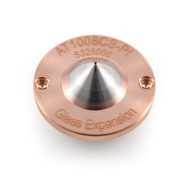 Platinum Skimmer Cone, Copper Base (G1833-65132) - For Agilent 7500cs/7500ce. Recommended for corrosive acids, including HF. For use with Pt sampling cone, and must be mounted on the brass skimmer base. Use 10x Magnifier Inspection Tool with Built-In LED Illumination (NC2042261) to inspect cone orifice condition. Use Skimmer ConeGuard (70-803-1004) to protect cone threads during cleaning. When not in use, keep cones stored in original packaging for protection.For routine applications, we recommend the standard Nickel Skimmer, see catalog number 501907564. Glass Expansion is ISO 9001:2015 certified by AB Certification, No. AU4501-9001