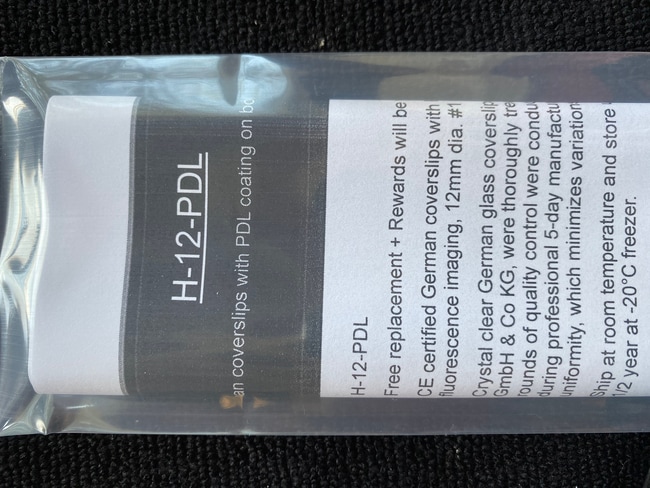 CE certified German glass coverslips with Poly-D-lysine coating on both sides for cell culture and confocal / IHC imaging with no autofluorescence. Pre-washed, nitric acid treated, coated with synthetic Poly-D-lysine on both sides and sterile. 12mm diameter round, #1 thickness, 45 pieces/pack. Ready to use directly in cell culture. Coverslips are sealed as 15 pieces per group for easy storage and enhanced cell culture quality. Shelf life 0.5 year when stored in chest freezer. User manual included.