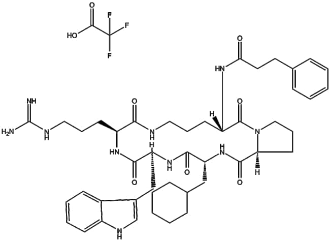 PMX 205 Trifluoroacetate is a cyclic hexapeptide antagonist targeting the complement C5a receptor (C5aR CD88) It is designed to competitively inhibit C5a binding to its receptor thereby modulating complement-mediated inflammatory pathways PMX 205 Trifluoroacetate exerts its biological activity primarily through competitive antagonism at C5aR reducing downstream inflammatory cellular responses In animal models PMX 205 Trifluoroacetate demonstrates anti-inflammatory effects Based on these pharmacological properties PMX 205 Trifluoroacetate holds research potential in the study of neuroinflammation Alzheimer s disease and chemically induced colitis