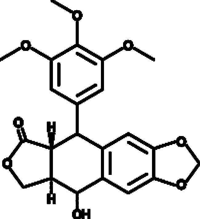A lignan with diverse biological activities; inhibits polymerization of isolated chicken brain tubulin (IC50 = 0.6 µM); induces mitotic arrest at the G2/M phase in CCRF CEM cells from 0.01 to 5 UG/ml; is protective against HSV-1 infection in Vero cells at 5 µM; inhibits proliferation of several DLBCL cell lines (IC50s = 0.0098-0.017 µM); a starting material in the semisynthesis of etoposide and teniposide