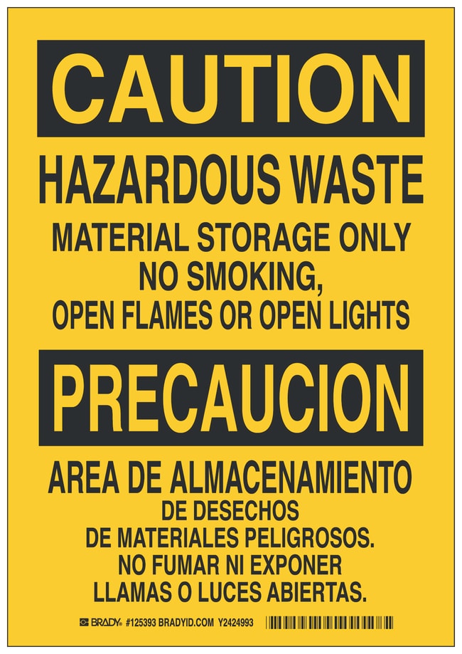Brady™ Polyester Caution/ Precaution Sign: HAZARDOUS WASTE MATERIAL STORAGE ONLY NO SMOKING, OPEN FLAMES OR OPEN LIGHTS/ AREA DE ALMACENAMIENTO …