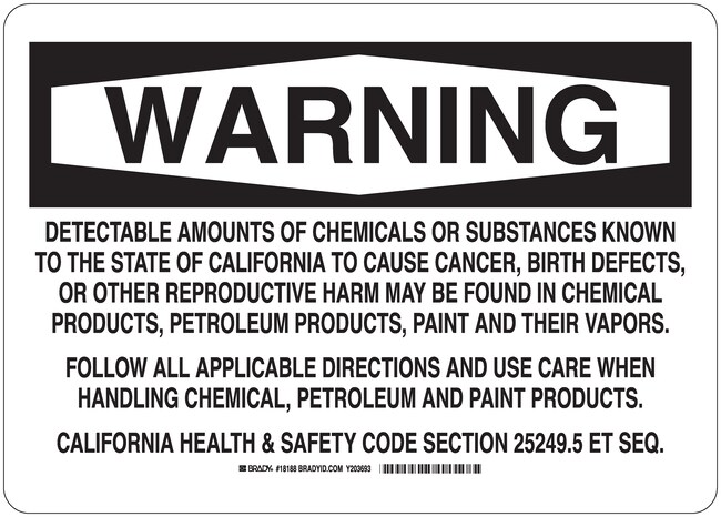 Displayed Text DETECTABLE AMOUNTS OF CHEMICALS OR SUBSTANCES KNOWN TO THE STATE OF CALIFORNIA TO CAUSE CANCER, BIRTH DEFECTS, OR OTHER REPRODUCTIVE HARM MAY BE FOUND IN CHEMICAL PRODUCTS, PETROLEUM PRODUCTS, PAINT AND THEIR VAPORS. FOLLOW ALL APPLICABLE DIRECTIONS AND USE CARE WHEN HANDLING CHEMICAL, PETROLEUM AND PAINT PRODUCTS.