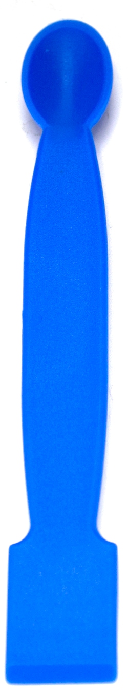 - Blue polypropylene spatula with oval scoop spoon on one end and flat edge with on the other end