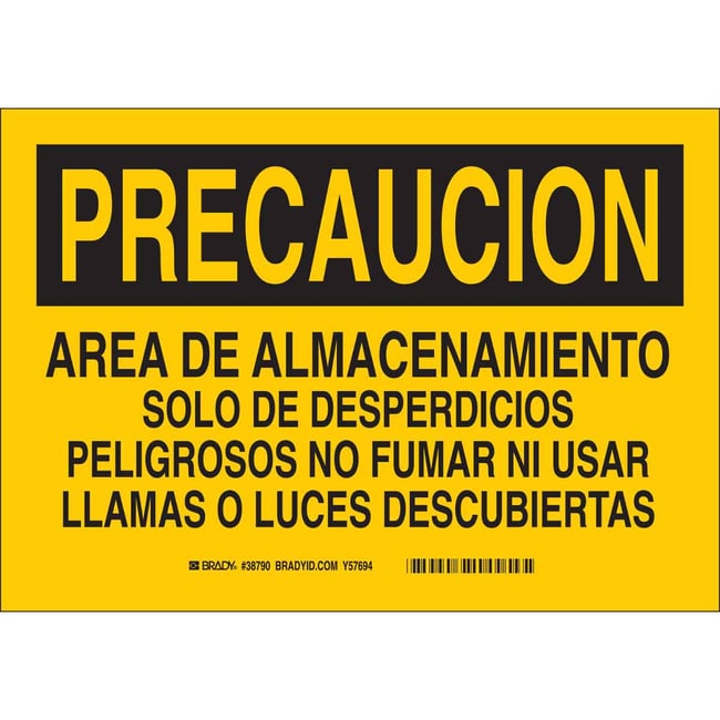Brady™ Polystyrene Sign: AREA DE ALMACENAMIENTO SOLO DE DESPERDICIOS PELIGROSOS NO FUMAR NI USAR LLAMAS O LUCES DESCUBIERTAS