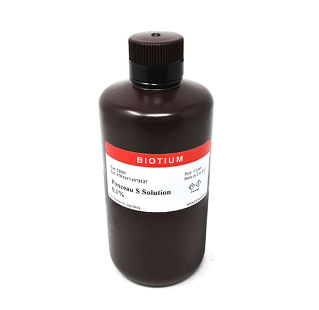 A red visible dye that rapidly stains proteins on western blotting membranes for easy visual inspection of protein transfer.Ponceau S is a classic visible red protein dye. It is commonly used during western blotting for easy visual inspection of protein transfer to PVDF and nitrocellulose membranes.Stains proteins on membranes pink or light redLimit of detection of about 250 ng of transferred proteinReversible and compatible with subsequent western blottingSolution contains 0.1% Ponceau S (w/v) and 5% acetic acid