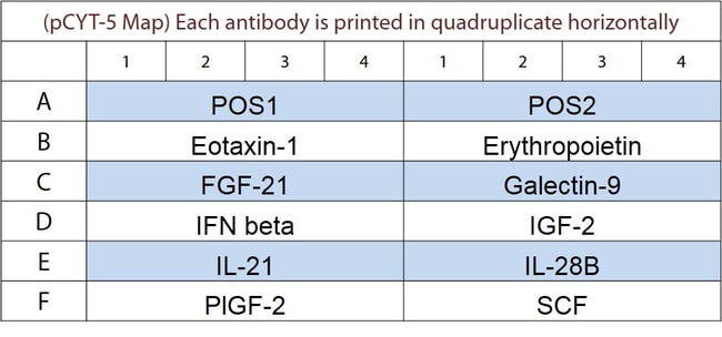 Detects 10 Porcine Cytokines. Suitable for all liquid sample types. Semi-Quantitative, Sandwich-based, Glass Slide Antibody Array Screen and compare protein expression levels with high specificity and sensitivity (pg/ml levels). The glass slide array allows for high throughput and low sample consumption; as little as 10 µl of original sample required per array. Proteins detected: Eotaxin-1, Erythropoietin, FGF-21, Galectin-9, IFN beta, IGF-2, IL-21, IL-28B, PlGF-2, SCF