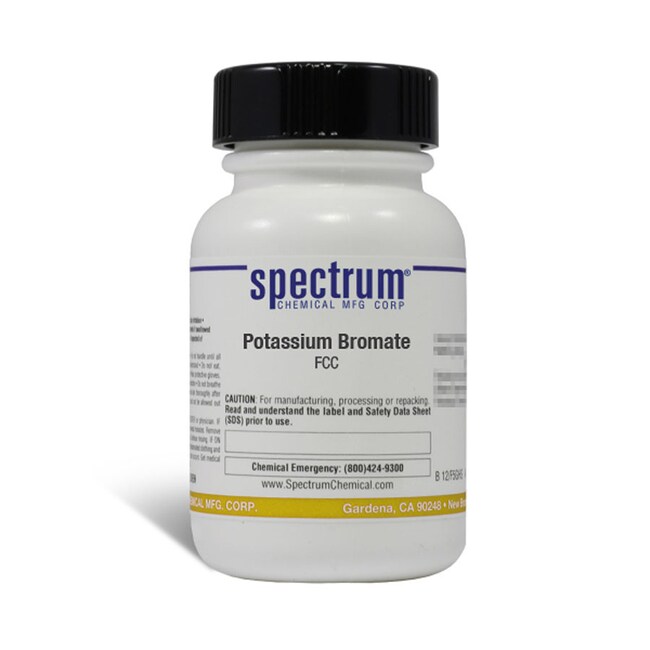 Spectrum™ Chemical Potassium Bromate, FCC is considered an oxidizing agent and has been used in the production of malt barley. The FCC grade meets the requirements of the Food Chemical Codex indicates and is suitable for all food, beverage and nutritional supplement applications. Spectrum Chemical offers over 300 Food grade chemical ingredients packaged in laboratory size bottles to production drum quantities and are manufactured, packaged and stored under current Good Manufacturing Practices (cGMP) per 21CFR part 211 in FDA registered and inspected facilities.
