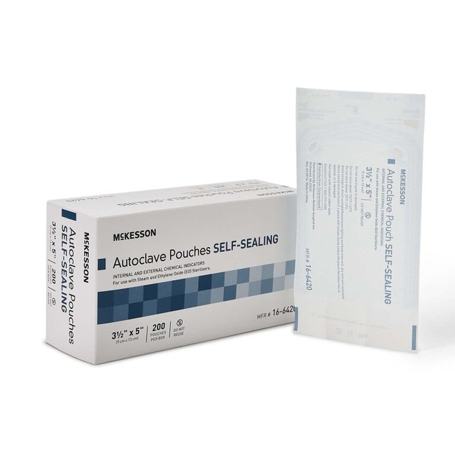 Sterilization Pouch McKesson Ethylene Oxide (EO) Gas / Steam 3-1/2 X 5 Inch Transparent Blue / White Self Seal Paper / Film For use with steam and ethylene oxide (EO) sterilizers Self-sealing, which makes pouches easy to open and close No autoclave tape necessary Internal and external chemical indicators Lead free ink 3½ x 5 inches