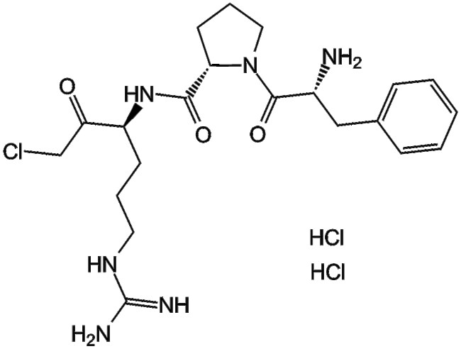 PPACK Dihydrochloride is a small-molecule inhibitor targeting human -thrombin It is designed to inhibit thrombin activity thereby blocking downstream platelet aggregation and coagulation pathways PPACK Dihydrochloride exerts its biological activity primarily through selective irreversible inhibition of thrombin by covalently occupying the thrombin active-site serine residue and forming a stable tetrahedral intermediate with the catalytic His57 residue Based on these pharmacological properties PPACK Dihydrochloride holds research potential in biomedical studies as an anticoagulant reagent and for investigating thrombin-mediated coagulation and platelet activation mechanisms